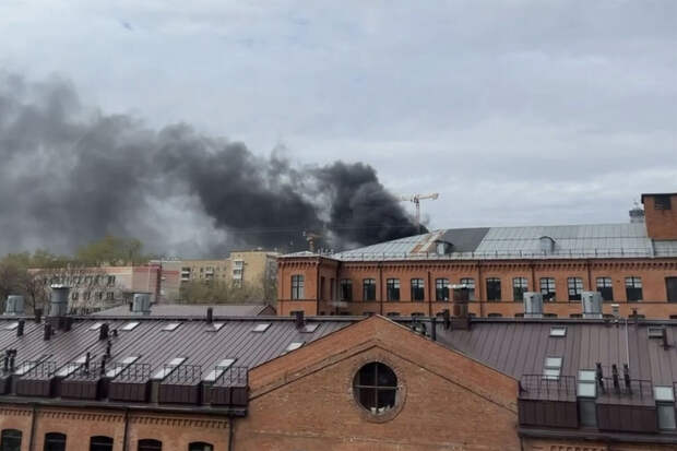 Материал дополнен кадрами с места ЧП. На них запечатлен густой черный дым, поднимающийся над красными зданиями.