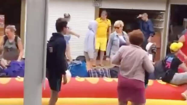 В Анапе на затопленной улице люди спасаются от воды на надувном аттракционе "Морской дракон". Об этом сообщает Telegram-канал Life Shot.