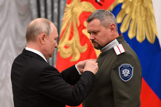 Командир казачьего батальона "Сибирь" Олег Ликонцев с позывным Кан стал первым казаком-добровольцем, которому присвоили звание Героя РФ. Накануне он получил заслуженную награду из рук президента России Владимира Путина, сообщает портал "Российское казачество".