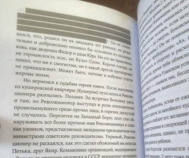 В приложенной к посту фотографии видно, что наверху одной из страниц книги скрыто за серыми полосами четыре строки. При этом в сноске сказано: "Фрагмент текста удален в соответствии с требованиями действующего законодательства Российской Федерации".