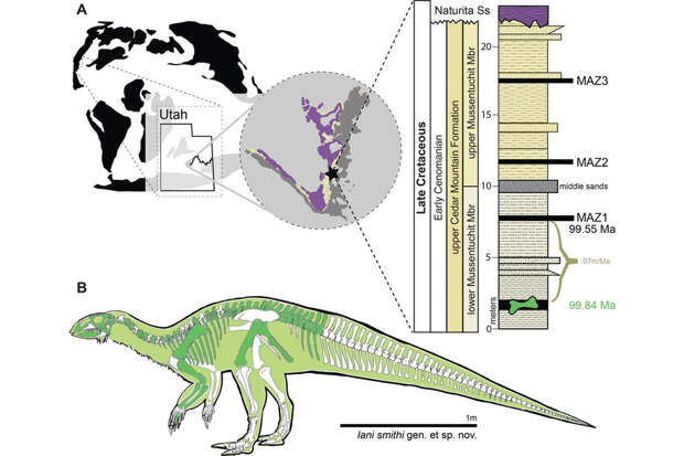 Окаменелые кости были найдены в формации Сидар-Маунтин в американском штате Юта. Вид получил название Iani smithi - в честь древнеримского бога Януса и палеонтолога Джошуа Аарона Смита. Он жил примерно в середине мелового периода, приблизительно 99 миллионов лет назад.