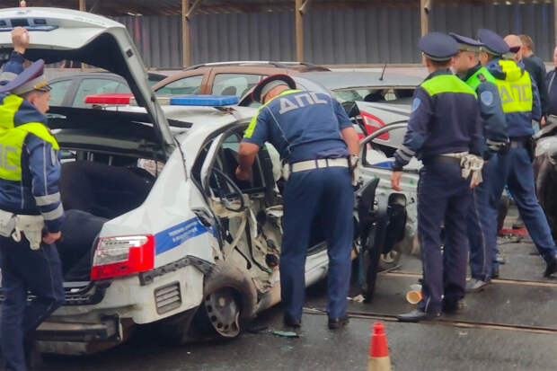 На кадрах с места происшествия видно, что патрульный автомобиль получил сильные механические повреждения. У BMW разбита передняя часть. Также на месте происшествия виден еще один автомобиль с разбитой боковиной.