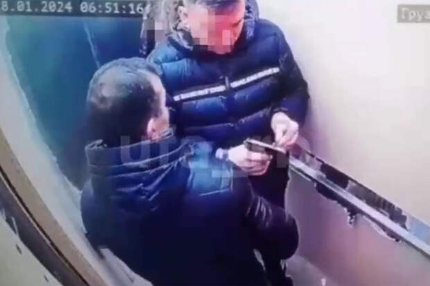 Инцидент произошел в ЖК "Символ". На кадрах заметно, как в лифт зашли двое мужчин и девушка. Один из пассажиров держит в руках пистолет и пытается перезарядить, после чего второй мужчина ему помогает.