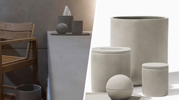 В коллекцию войдут пять предметов, выполненных из бетона: ведро для мусора, туалетный столик, коробка для салфеток и два контейнера. Обновить интерьер ванной комнаты товарами от Кардашьян будет недешево – набор из пяти предметов будет стоит $355.