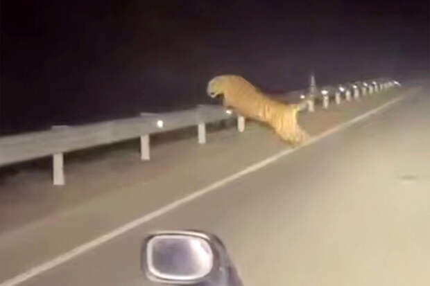 В Хабаровском крае тигр вышел на трассу и метался перед автомобилем. Об этом сообщает Telegram-канал Amur Mash.