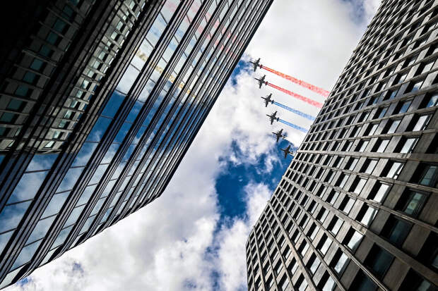 В Москве прошла репетиция воздушной части парада Победы. Над столицей пролетели самолеты, нарисовав в небе триколор, ролик публикует РБК.