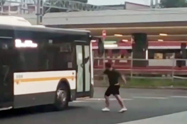 На опубликованных в сети кадрах видно, как мужчина поднимает с проезжей части предмет и бросает его в общественный транспорт, при этом разбивает двери автобуса.