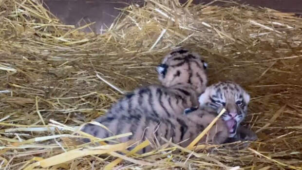 У мальчиков и девочки пока что плохо видны зубы, их глаза еле открыты, рычать они тоже не умеют. Однако тигрята активно пьют молоко, поэтому совсем скоро они окрепнут и станут походить на взрослых тигров. Багира - так зовут самку - от материнства немного устала. Она хотела выйти из комнаты, которую ей построили для родов, но сотрудники зоопарка не разрешают маме покидать тигрят надолго, чтобы они не замерзли. Тигрица заботится о своих детях, она смотрит, куда ставит лапы, чтобы случайно никого не раздавить.