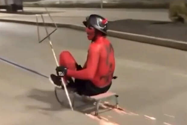 В Горно-Алтайске мужчина, изображавший черта, прокатился по улицам города на санях, сообщает Telegram-канал Mash Siberia. В качестве буксира выступал питбайк.