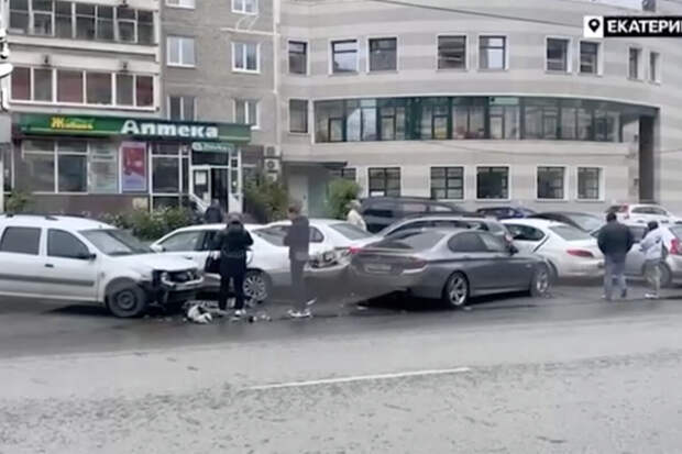 В Екатеринбурге произошло ДТП с участием шести автомобилей. Об этом сообщает Telegram-канал Ural Mash.