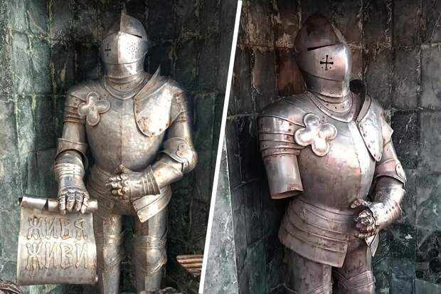 Статуя изображает рыцаря в полном боевом облачении. В одной руке он держит свиток с надписью "Живя живи", а другой опирается на меч. На фото из города видно, что теперь у фигуры нет не только этих атрибутов, но и левой руки до локтя.
