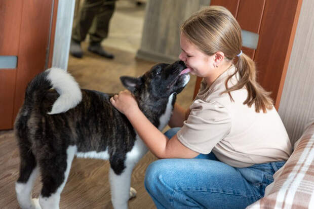 Отмечается, что школьница мечтала о собаке именно этой породы после просмотра фильма про Хатико. Когда ей принесли домой щенка, девочка расплакалась от радости.