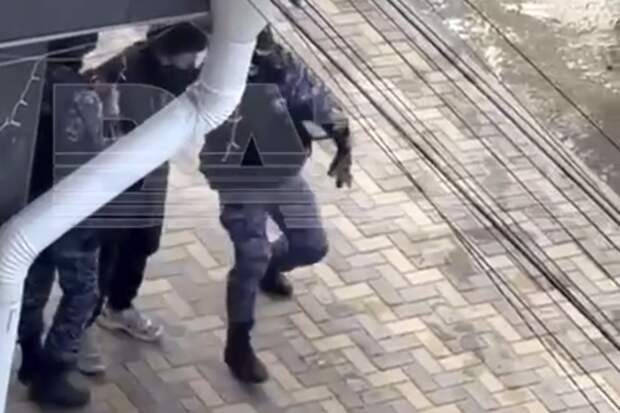 Baza опубликовала кадры предполагаемого задержания сотрудниками Росгвардии напавшего на техникум в Анапе. На опубликованных кадрах два правоохранителя задерживают молодого человека, который, вероятно, устроил стрельбу у учебного учреждения.