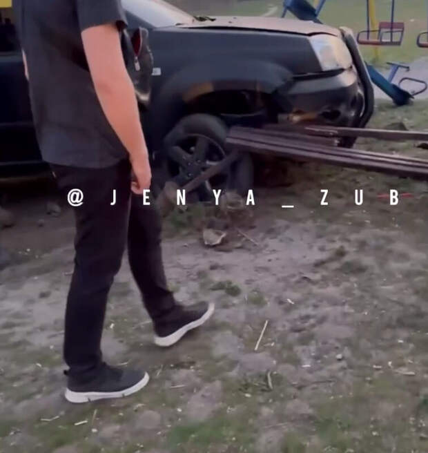 Кадры потасовки, произошедшей в вечерние часы, попали в сеть. Машина снесла лавку, стоявшую на площадке.