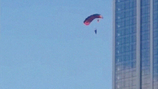 На видео человек спрыгивает с высоты. Он пролетает несколько этажей, после чего раскрывается парашют.