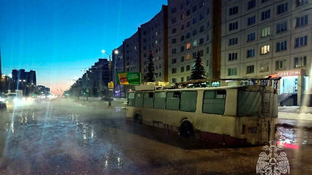Отмечается, что участок дороги, по которой ехал троллейбус, затопило после коммунальной аварии. Вода залила салон. На приборной панели в кабине троллейбуса произошло короткое замыкание.