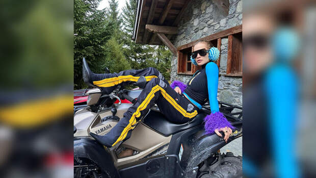 32-летняя певица отдыхает на горнолыжном курорте во Франции и устраивает фотосессию на фоне шале и квадроцикла. На снимках она позирует в черных брюках-карго с желтыми полосками от Diesel, лазурном лонгсливе с фиолетовыми манжетами из перьев и "колючих" наушниках от Chet Lo.