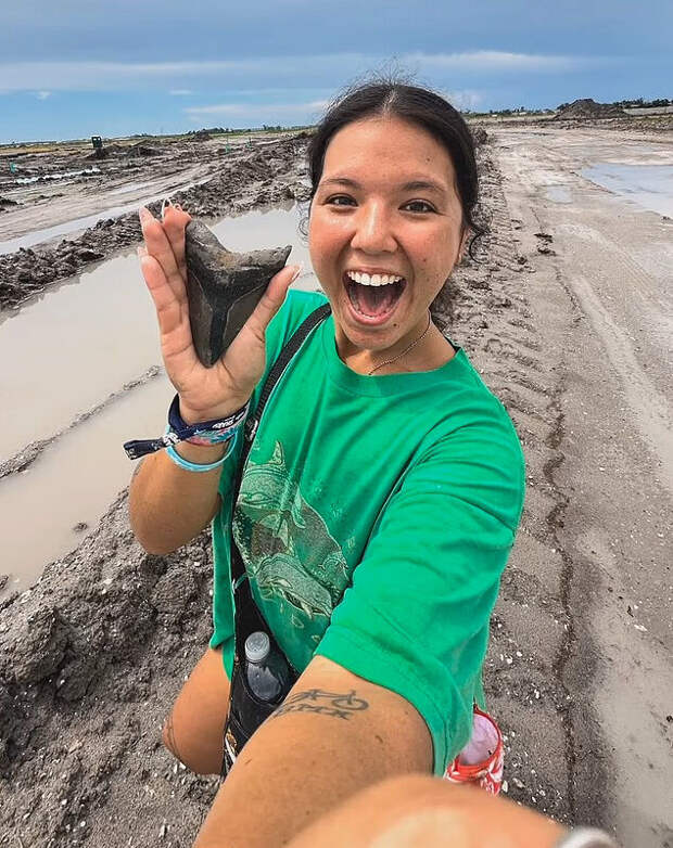 Прогулка 26-летней Николь Меркури по западному побережью Флориды обернулась сенсацией — женщина обнаружила на пляже отлично сохранившийся зуб доисторической акулы мегалодона. По ее словам, треугольный объект частично торчал из песка.