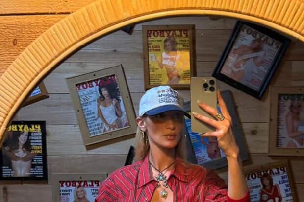 Белла Хадид стояла перед зеркалом в красном облегающем топе с глубоким декольте, который дополнила рубашкой в клетку в тон. Модель также надела синие джинсы с коричневым ремнем, бело-синюю кепку, ожерелье, серьги, кольца и браслеты.