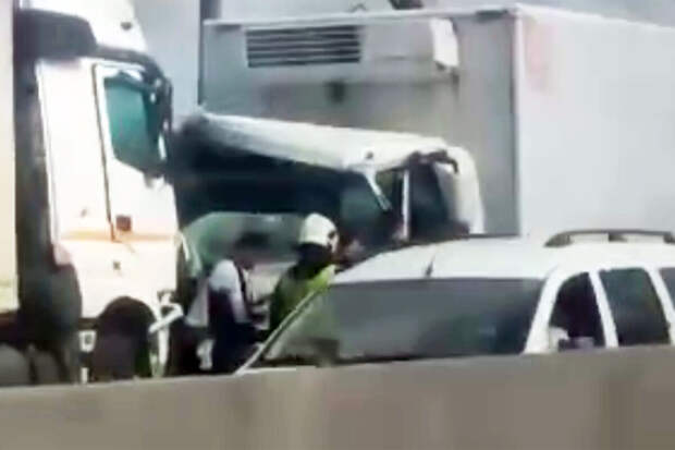 Очевидцы запечатлели последствия инцидента на видео. На кадрах видно, что повреждения получили два большегруза.