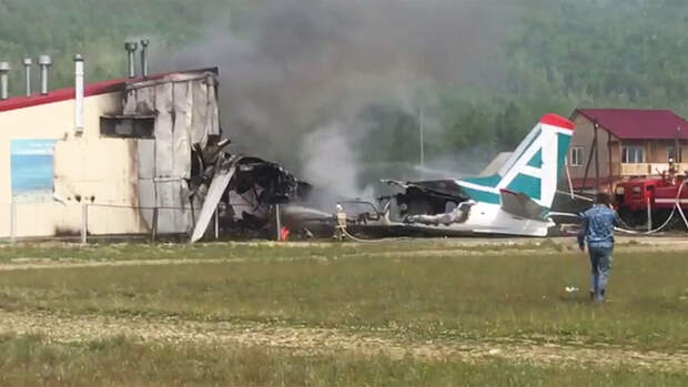 В воздухе у самолета отказал один из двигателей, после посадки воздушное судно выехало за пределы взлетно-посадочной полосы, врезалось в одно из сооружений и загорелось.