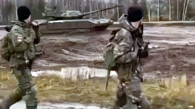 На видео показано, как несколько военнослужащих идут по асфальтированной дороге, а в нескольких метрах от них по грязи на большой скорости двигается танк, который обгоняет колонну.
