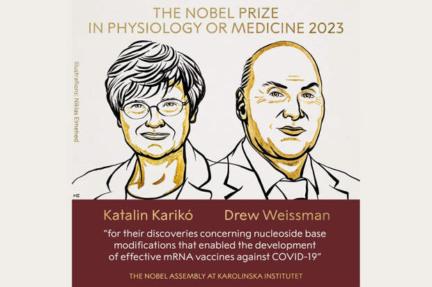 Лауреатом Нобелевской премии по физиологии и медицине в 2023 году стали биохимики Каталин Карико и Дрю Вайсман за открытия, касающиеся модификаций нуклеозидных оснований, которые позволили разработать эффективные мРНК-вакцины против COVID-19. Их имена представители Нобелевского комитета объявили на церемонии, прошедшей в Стокгольме.