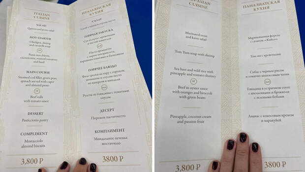 )", - написала она в Telegram-канале.Также Собчак опубликовала фотографии четырех видов меню в буфете, добавив, что все позиции "звучат не очень".