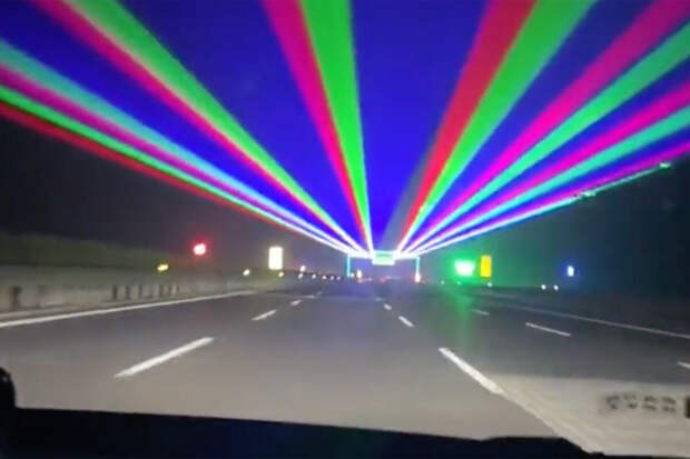 Как пишут СМИ, лазеры установили с целью повысить безопасность дорожного движения и сократить число случаев ДТП из-за уснувших за рулем водителей. Система работает в темное время суток, освещая цветными полосами небо над шоссе.
