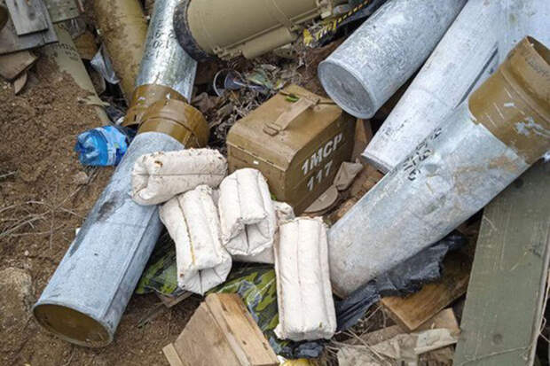 Разведчик утверждает, что это патроны и снаряды образца НАТО."Нам показалось странным, что лежало много желтых повязок (обозначают принадлежность к украинским войскам)", — рассказал разведчик.