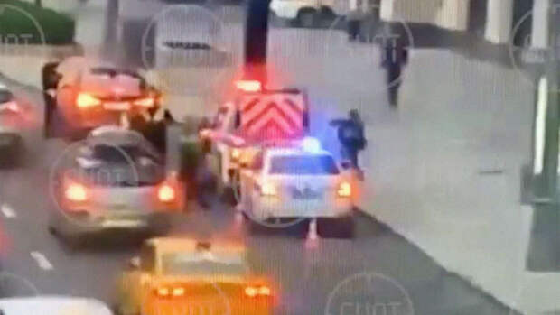 Мужчина залез на крышу автомобиля дорожно-постовой службы в Москве. Видео опубликовал Telegram-канал Shot.