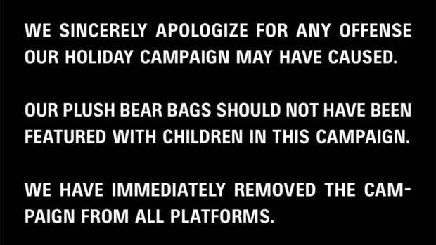 Наши сумки в виде плюшевых медвежат не должны быть отрекламированы с участием детей. Мы немедленно удалили фотографии из кампании со всех платформ", - заявил бренд.Бренд также попросил прощения за то, что на одной из фотографий, как заметили пользователи, реквизитом послужила копия федерального закона США о борьбе с детской порнографией.
