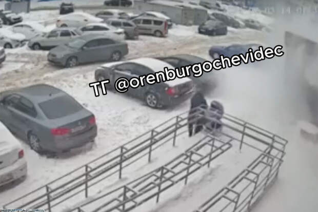 Оренбурженка успевает переместить коляску из-под падающего снега.До этого, 4 февраля, в Казани глыба снега рухнула с крыши дома на 11-летнего мальчика. Ребенка госпитализировали с травмами, подробности о его состоянии не сообщались. Прокуратура начала проверку по факту произошедшего.
