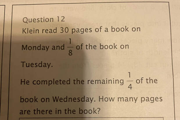 "Кляйн прочитал 30 страниц книги в понедельник и одну восьмую часть во вторник. В среду он дочитал оставшуюся одну четвертую часть. Сколько страниц в книге?" - таково было условие задачи.