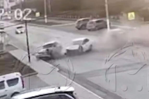 Уличная камера запечатлела инцидент. На кадрах заметно, как в момент столкновения автомобильные детали разлетелись по проезжей части.