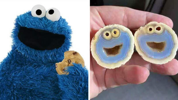 Внутри Бауэрса ждал сюрприз: невзрачный, похожий на яйцо камень в разрезе выглядел как лицо Коржика, любителя печенья из детского телешоу "Улица Сезам".Как геолог рассказал изданию Daily Mail, камень передал ему бразилец Лукас Фассари, обнаруживший его на территории штата Риу-Гранди-ду-Сул в ноябре 2020 года.
