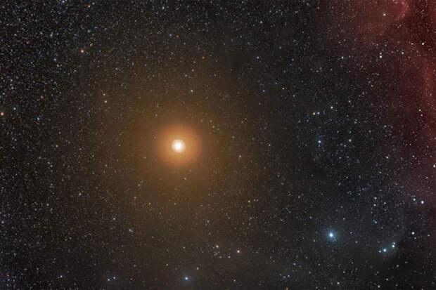Бетельгейзе - красный сверхгигант на поздней стадии эволюции, одна из самых ярких звезд на небосклоне, расположенная в 600 световых годах от Земли.