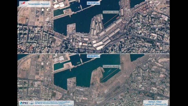 Российский спутник дистанционного зондирования Земли "Канопус-В" снял последствия взрыва, произошедшего 4 августа в порту Бейрута. Фотографии до и после катастрофы размещены в Telegram-канале Роскосмоса.