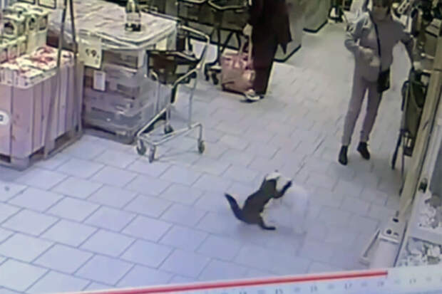 Журналисты также опубликовали кадры с камер наблюдения из торгового зала, на которых видно, как кошка нападает на собак, с которыми покупатели заходят в магазин.