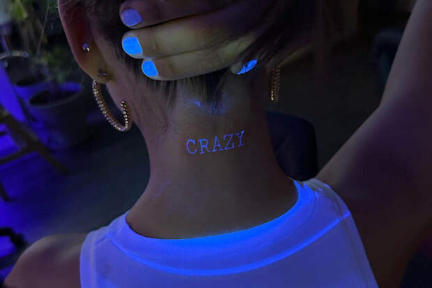 Алеся Кафельникова опубликовала фото, на котором показала новую неоновую татуировку на шее. Модель набила себе надпись "Crazy".