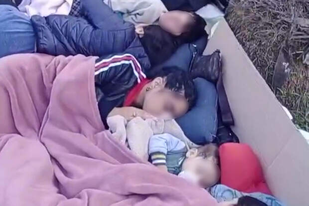 Несколько подростков устроили импровизированный ночлег прямо на земле, дети спали на спальных мешках и ими же укрывались, один из них прижимает к себе младенца с соской.