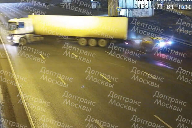 На видео, которое опубликовал Дептранс, показано, что большегруз врезался с такси, которое двигалось задним ходом. После столкновения фура ударилась в отбойник и перевернулась. Информации о пострадавших пока нет. Движение не затруднено, отмечается в публикации.